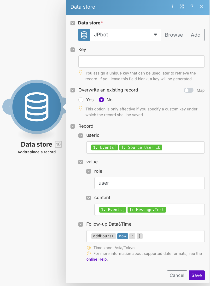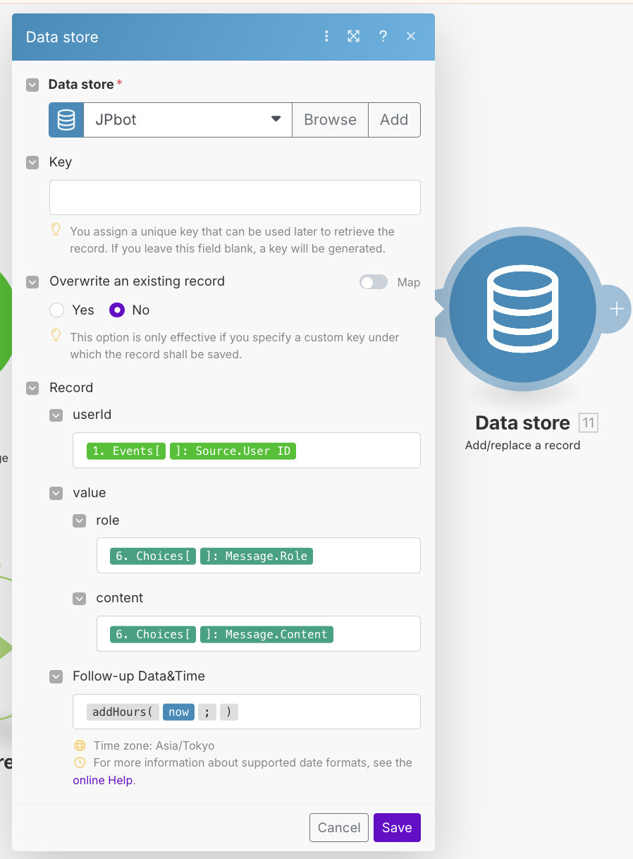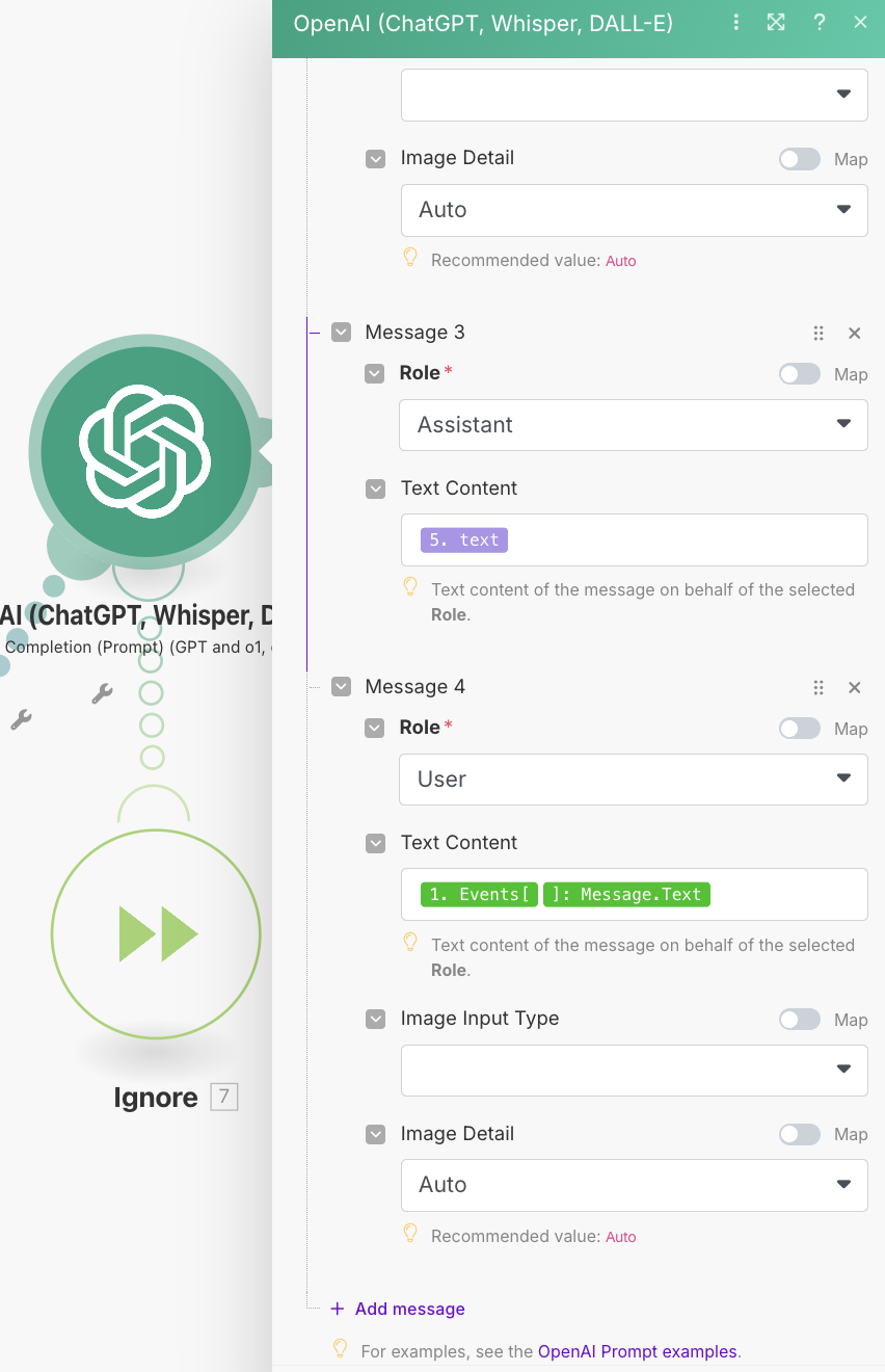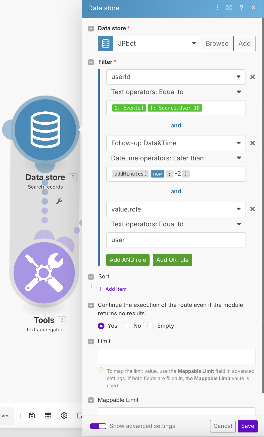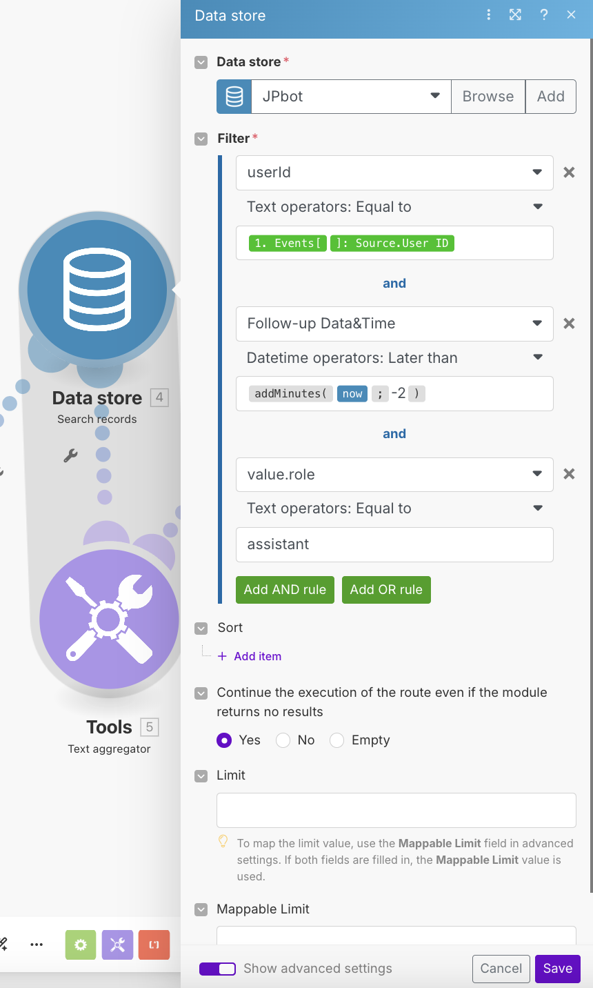 - Second Data Store: Retrieves the chatbot’s (assistant’s) reply history within the last