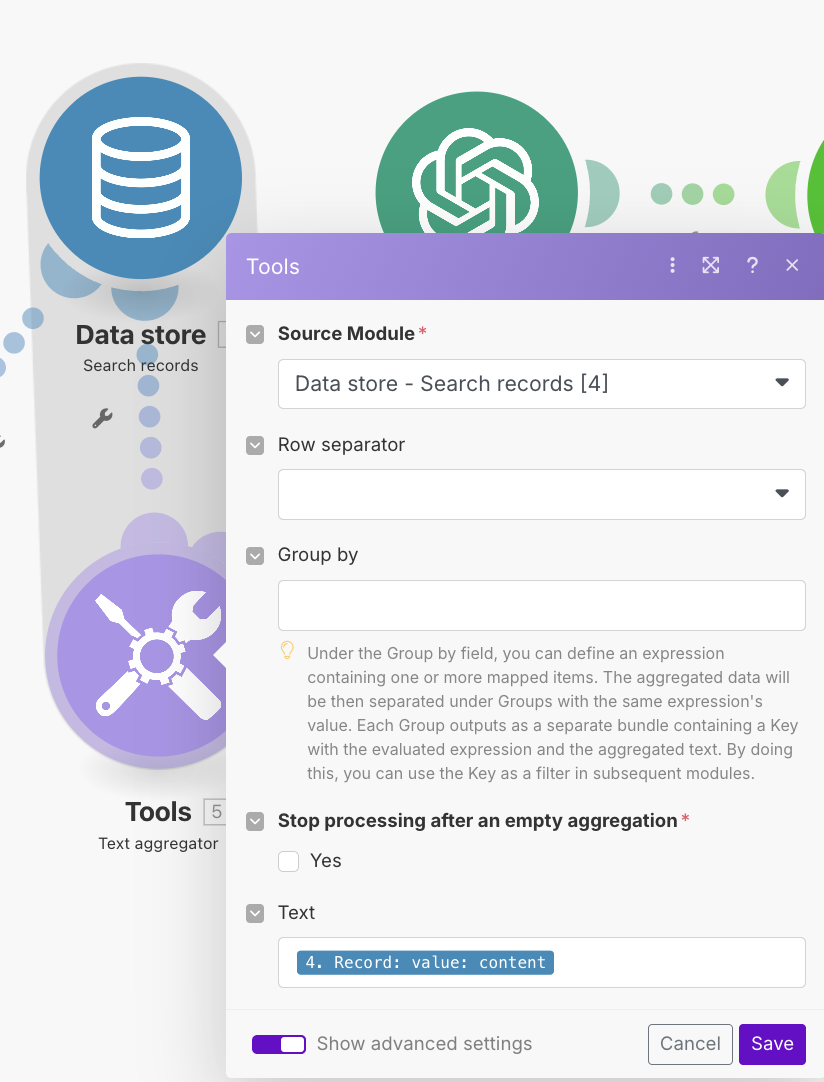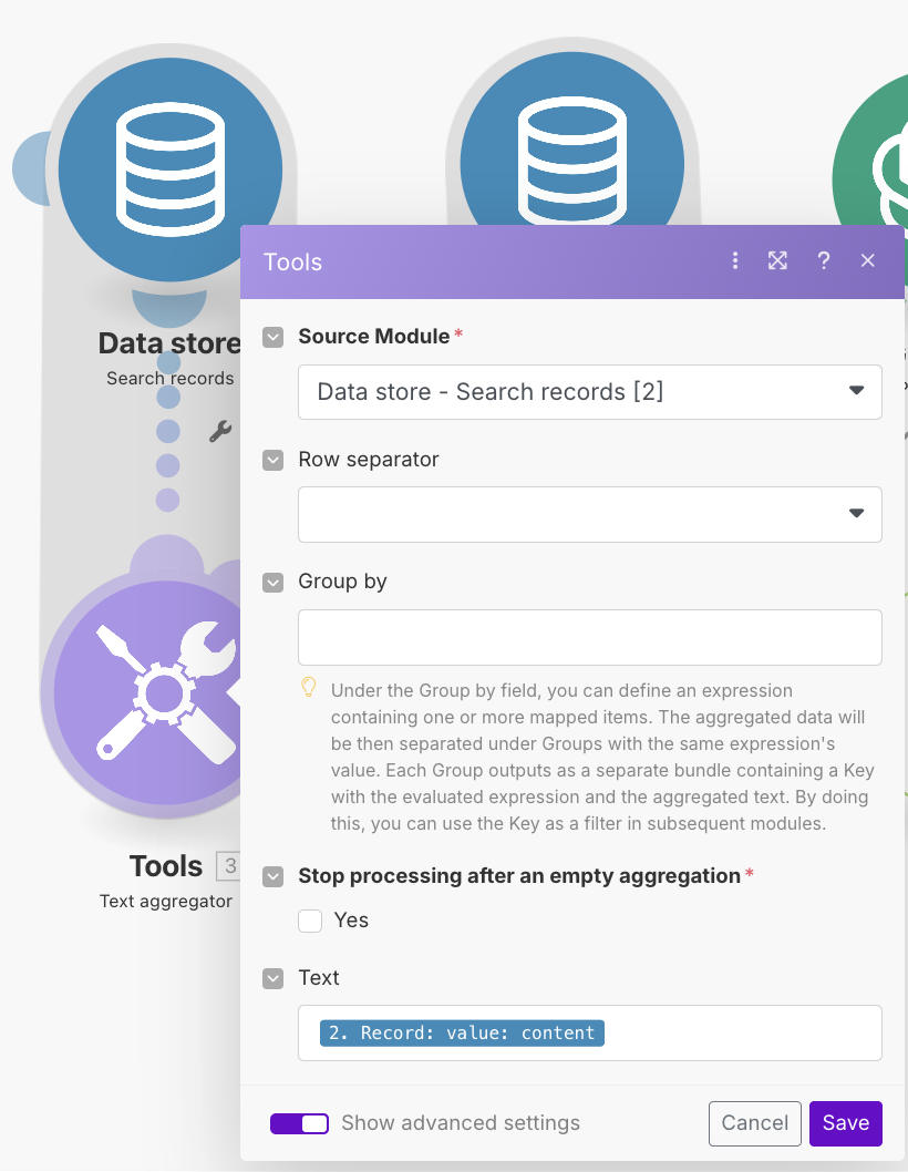 We’ll create this workflow using a MAKE scenario — a series of modules that define how data flows and transforms between services. Learn more about scenarios here.